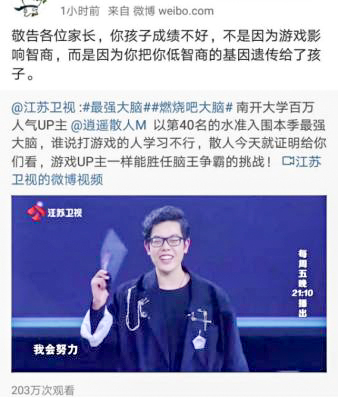 主持人蔣昌建說:“我們一般的印象,當然是刻板印象,覺得玩游戲的人好像成績都不一定特別的好。”