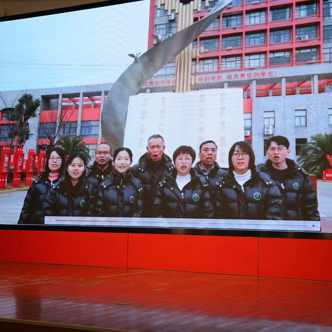 就在此時,教師們的祝福視頻出現在大屏幕上,初中部教師以教研組為單位,向學生錄制了屬于自己最珍貴的建議與最誠摯的祝愿。看著自己的授業恩師接連閃現,同學們沸騰了,大報告廳里洋溢著溫馨與激情。其中以社政組的視頻最有創意,以情景劇的形式,師生共演,贏得了陣陣掌聲與歡呼。